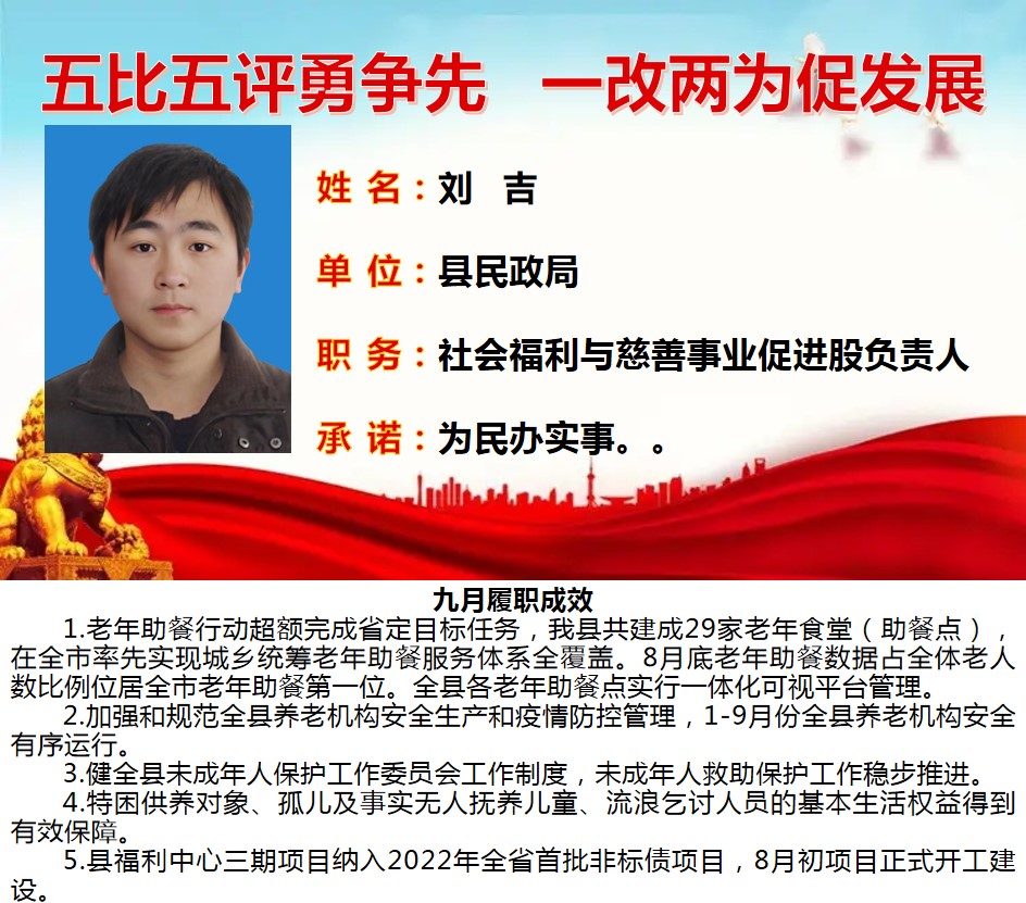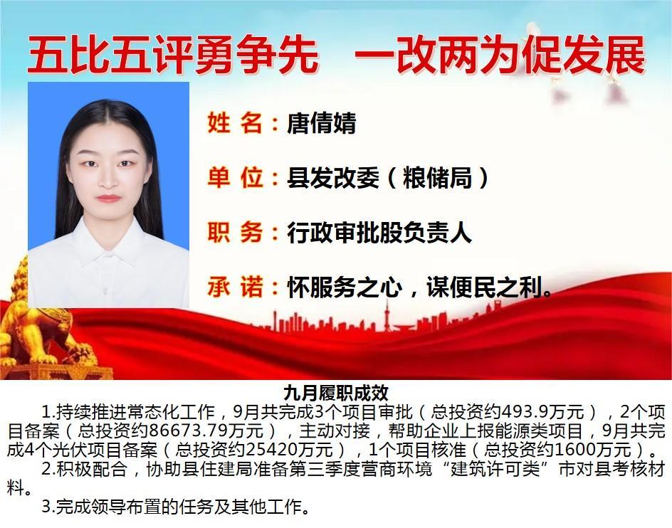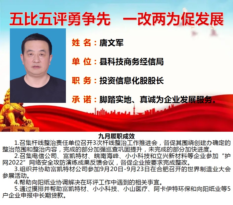 为深入学习贯彻习近平总书记关于作风建设重要论述、落实省委“一改两为五做到”要求,着力解决个别干部作风中“虚、躲、冷、粗、假”等顽瘴痼疾,我县组织开展了县直单位百名股长“五比五评”活动。根据活动《实施方案》要求,现将2022年度100名参评对象9月份履职成效分期进行公示。