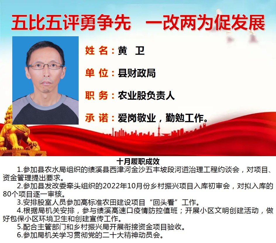为深入学习贯彻习近平总书记关于作风建设重要论述、落实省委“一改两为五做到”要求,着力解决个别干部作风中“虚、躲、冷、粗、假”等顽瘴痼疾,我县组织开展了县直单位百名股长“五比五评”活动。根据活动《实施方案》要求,现将2022年度100名参评对象10月份履职成效分期进行公示。