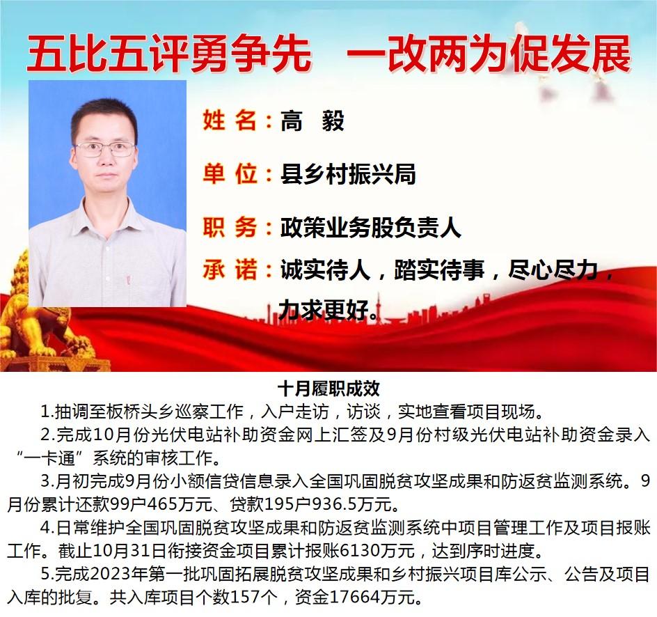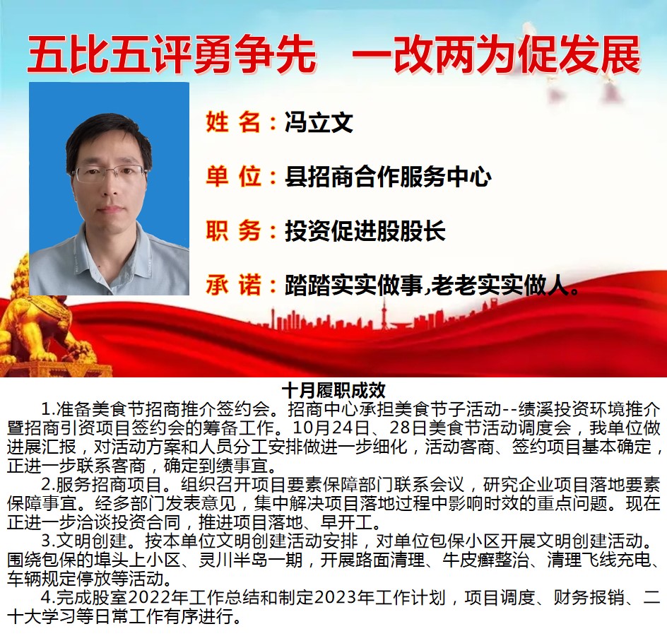 为深入学习贯彻习近平总书记关于作风建设重要论述、落实省委“一改两为五做到”要求,着力解决个别干部作风中“虚、躲、冷、粗、假”等顽瘴痼疾,我县组织开展了县直单位百名股长“五比五评”活动。根据活动《实施方案》要求,现将2022年度100名参评对象10月份履职成效分期进行公示。