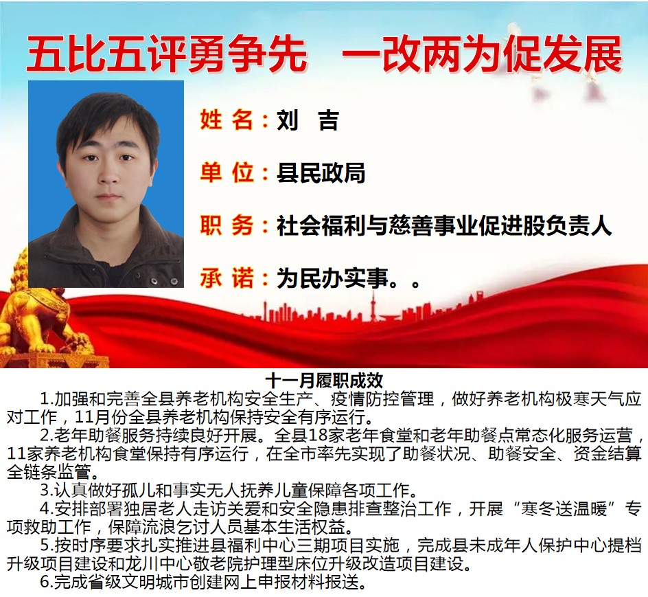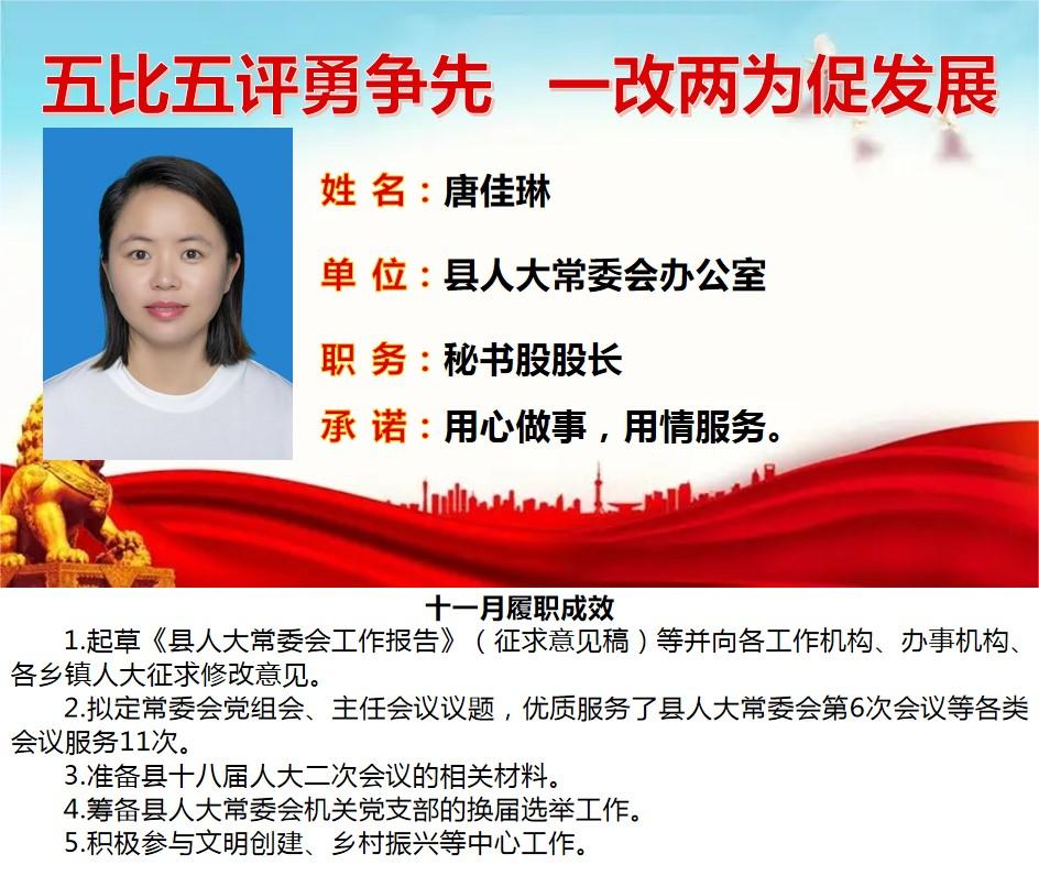 为深入学习贯彻习近平总书记关于作风建设重要论述、落实省委“一改两为五做到”要求,着力解决个别干部作风中“虚、躲、冷、粗、假”等顽瘴痼疾,我县组织开展了县直单位百名股长“五比五评”活动。根据活动《实施方案》要求,现将2022年度100名参评对象11月份履职成效分期进行公示。