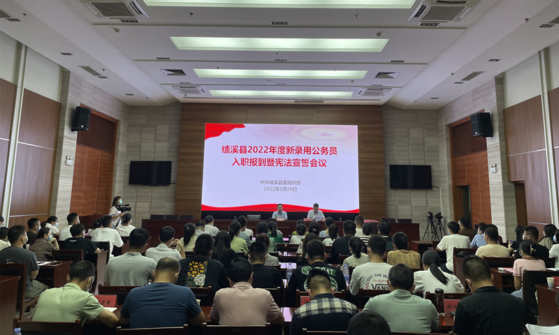 8月29日下午,绩溪县举办2022年度新录用公务员入职报到暨宪法宣誓会议,县委常委、组织部长王林出席会议并讲话,2022年新考录的60名公务员、各招录单位分管领导、组织部相关科室参加了会议。会议由县委组织部副部长王绪强主持。