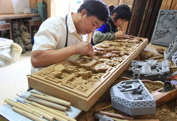 1986年出师后,宋文革一直从事传统徽派家具、雕花和民房修复。因此,在跟随师傅学习和修复民宅的过程中,见到不少徽州早期“三雕”实物,当他看到很多人为损坏的砖雕遗迹,无不痛心疾首,所以萌生了还原砖雕作品的想法。