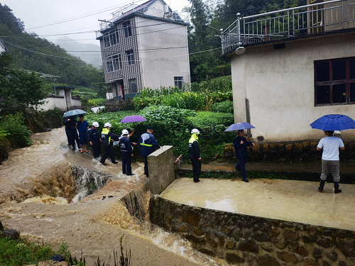 将群众安全撤离后,乡村干部和徽岭救援队立即赶往险情现场,通过装填、堆砌沙袋,山上来的水流被引入排水沟。救援人员一个半小时紧张而有序的配合下,下午3时30分,原本要泻入居民区的水流被完全阻断,险情处理完毕,隐患得到及时化解。