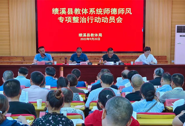 近日,绩溪县教体系统师德师风专项整治行动动员大会在县实验小学举行,县教体局全体机关干部和各中小学校校长、幼儿园园长参加了会议。会议宣读《2022年绩溪县师德师风专项整治实施方案》并作政策解读。绩溪中学、适之中学、实验小学和荆州中心小学负责人作了表态发言。县教体局党委书记、局长胡明利作动员讲话时指出,师德师风建设是一项长期而又艰巨的任务,也是义不容辞的责任。要求大家要以此次专项整治活动为新起点,切实把提高自身职业道德修养作为一件大事来干,作为一件重要工作来抓,以高度的政治责任感和工作使命感,以更加积极的态度、务实的作风、有效的举措,不忘初心、不负韶华,努力把我县师德师风提高到一个新的水平,以实际成效迎接党的二十大胜利召开。