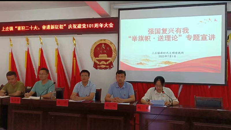 举行重温入党誓词活动、新党员代表入党宣誓仪式。镇机关支部全体党员在全镇“喜迎二十大、奋进新征程”庆祝建党101周年大会上面向鲜红的党旗,重温入党誓词。上庄村、五联村党支部在爱国教育基地宏村纪念馆前的宣誓声高亢激昂,旺川村党总支在柯村暴动纪念馆前的宣誓声铿锵有力,宅坦村党支部全体党员在老党员座谈会上,通过重温入党誓词,牢记入党初心。