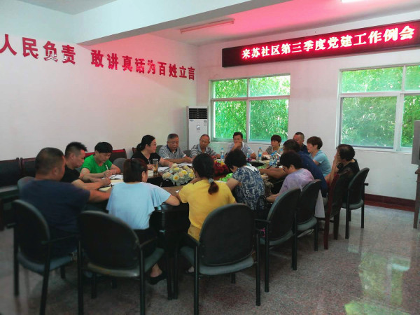 7月30日上午,来苏社区召开2019第三季度党建工作例会,社区党委委员、各网格支部书记、委员参加会议,党委书记许兵主持会议。