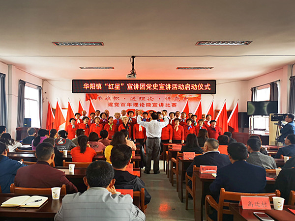 在凤灵社区老小孩合唱团的大合唱《没有共产党就没有新中国》《唱支山歌给党听》中,4月25日,华阳镇“举旗帜·送理论·讲党史”建党百年理论微宣讲暨“红星”宣讲团党史宣讲活动启动仪式拉开序幕。当天,来自镇机关一支部、关工委、村(社区)的10位选手走上演讲台,用深入浅出、富有生命力的语言,生动形象、极具感染力的宣讲,讲述中国共产党的历史、讴歌党的丰功伟绩、展示华阳党员干部凝心聚力谋发展的精神风貌。