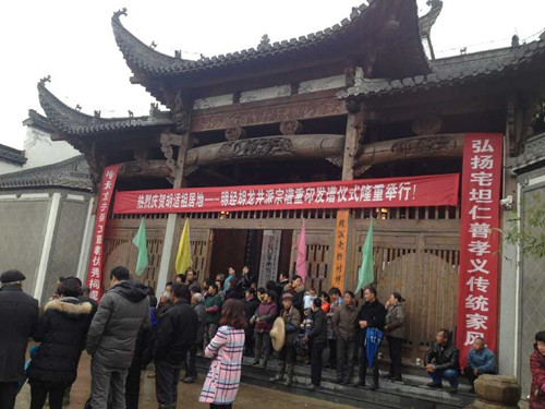 12月9日上午9时,位于上庄镇宅坦村博物馆内举行“胡适祖居地——明经胡龙井派宗谱新修发谱仪式”。现场鼓乐喧天,鞭炮齐鸣,来自宅坦村五门派、迁出支派(旌德 歙县)、邻村贵宾、旅外人士等共计200余人欢聚在此,热闹非凡。