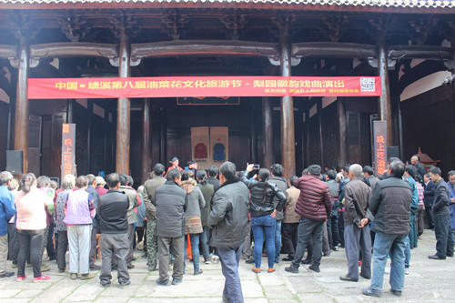 演出现场热闹非凡,许氏宗祠挤满了观众。演出首先表演了腰鼓队表演的《花海鼓乐》和黄梅戏舞蹈《油菜花开》,原汁原味的演出得到了广大游客和村民的赞赏。随后,表演了《柜中缘》、《春香传选段》、《西厢记*小姐多风采》等多段戏曲节目,各位演唱表演者扮唱俱佳,现场观众们观看的如痴如醉,精彩的演出不时博得大家的阵阵掌声。最后,由家朋乡尚村广场舞蹈队表演的《舞动家朋》节目将整个演出推向了高潮。
